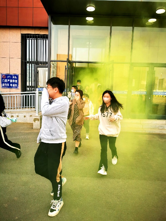 二、实验室突发火灾,烟雾弥漫,要求各实验室人员配带口罩,有条件的用湿毛巾掩盖口鼻,尽快从所属楼层安全通道疏散到实验楼外东侧灭火演练场地。