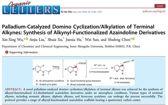 该研究首次将末端炔烃结构引入到氮杂吲哚骨架的构建中,丰富和发展了构筑氮杂吲哚结构的合成新方法。为后续发展高效、实用的钯催化串联环化过程合成结构复杂的有机骨架提供了良好的基础。相关研究成果发表在化学类一区TOP期刊上(Org. Lett.2018, 20, 1538.)。