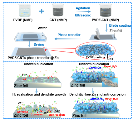 水系锌离子电池(AZIBs)由于其高安全性、资源可用性和环境友好性而具有非常好的应用前景。然而,Zn负极的不稳定影响了AZIBs的实际应用。Zn表面的枝晶形成和析氢反应( HER )显著降低了ZIBs的库伦效率和循环稳定性。刘健教授团队通过相转移法设计了一种多孔导电保护层来稳定锌负极(PVDF/CNTs-PT @ Zn),有效抑制了Zn枝晶的产生和H2O引发的副反应,实现了均匀沉积。