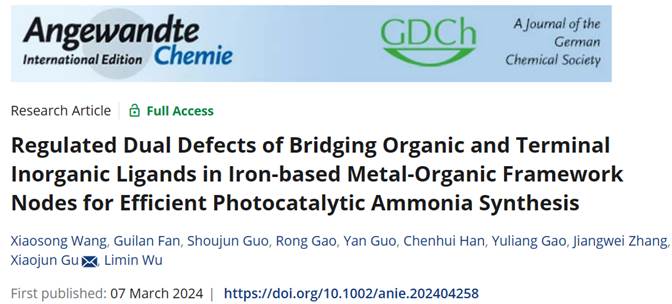 近日,db旗舰和能源材料化学研究院武利民教授和谷晓俊教授联合团队取得重要研究进展,相关成果在化学领域的国际顶级学术期刊Angew. Chem. Int. Ed.上发表,题为“Regulated Dual Defects of Bridging Organic and Terminal Inorganic Ligands in Iron-based Metal-Organic Framework Nodes for Efficient Photocatalytic Ammonia Synthesis”(论文连接:https://onlinelibrary.wiley.com/doi/10.1002/anie.202404258)。db旗舰博士研究生王晓松为第一作者,武利民教授、谷晓俊教授及张江威研究员为通讯作者,db真人为论文第一完成单位。