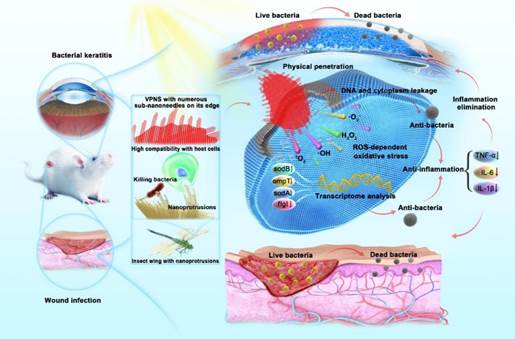 图1. VPNS通过外周次级纳米针结合诱导的物理破坏结合氧化应激抗菌机制治疗伤口感染和细菌性角膜炎