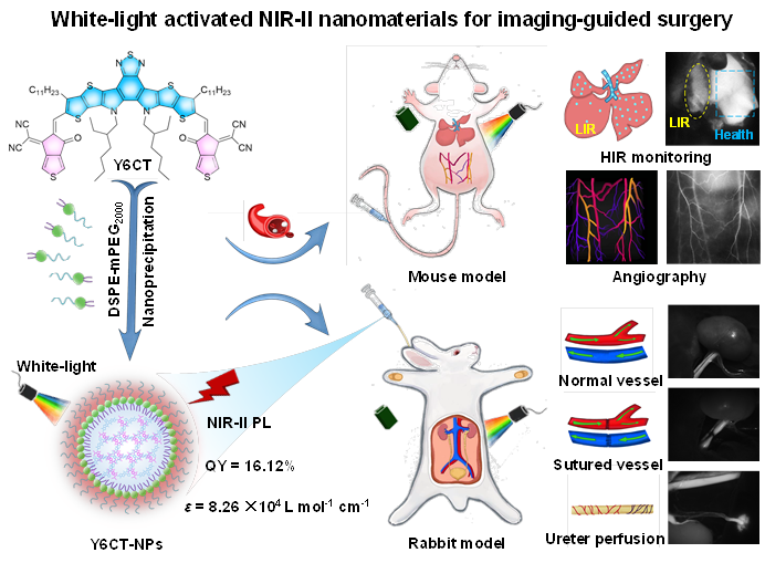 本论文首次报道了一种π-π驱动组装的白光激发的近红外II区有机纳米颗粒Y6CT-NPs,其荧光亮度是目前已报道的最亮近红外II区有机纳米造影剂的两倍多。Y6CT-NPs优异的光学性能使其能够实现白光激活的小鼠腹部血管高分辨率成像、术中实时监测肝缺血再灌注过程,并实现了白光激发近红外II区成像引导的兔肾移植手术,以接近真实临床场景的方式实现对肾脏血管的可视化和精确识别、异体肾脏移植血管重建后评估以及输尿管血供分析。该技术成功解决了传统激发光源所带来的荧光手术导航应用瓶颈问题。