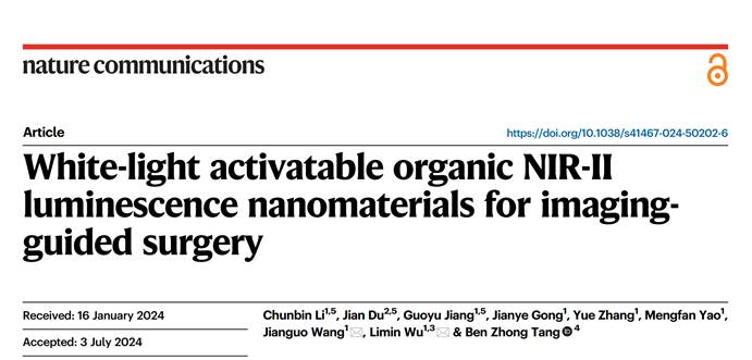 近日,db旗舰王建国教授和能源材料化学研究院武利民教授联合团队在国际顶级期刊Nature Communications上发表题为“White-light activatable organic NIR-II luminescence nanomaterials for imaging-guided surgery”(Nat. Commun., 2024, 15, 5832)的重要研究成果。该团队首次构建了一种白光激活的高亮度A-D-A型近红外II区有机纳米微球材料并将其应用于成像引导的精准手术导航。db旗舰博士研究生李纯斌、姜国玉教授以及山东第一医科大学第一附属医院泌尿外科主治医师杜健为论文的共同第一作者,武利民教授和王建国教授为通讯作者,db真人为本论文的第一完成单位。
