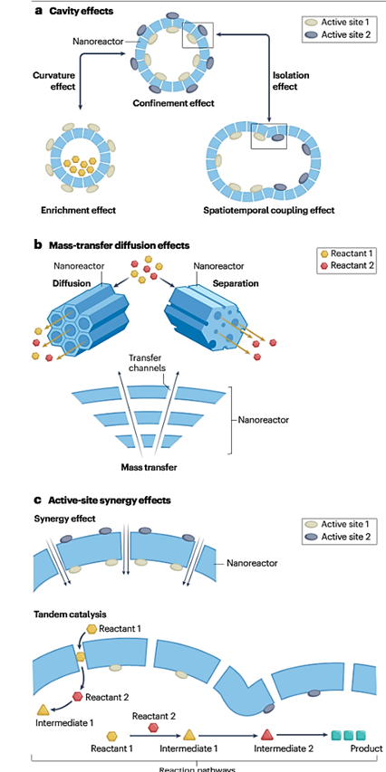 多孔纳米反应器型材料可以引发特殊的结构-活性相互作用,包括空腔限域效应、传质扩散和活性位点协同效应。纳米反应器中明确的空腔结构可以形成局部高度富集的反应物微环境,大大提高分子的有效碰撞率几率,从而提高整体的化学反应速率。中间体及目标产物的扩散主要与孔隙结构、腔室结构有关。同时,纳米反应器还可以提供多层次、多维度(如壳内外或不同腔室之间)的空间来锚定位点。这使其成为研究活性位点之间协同效应及其独特催化反应机理的理想平台。
