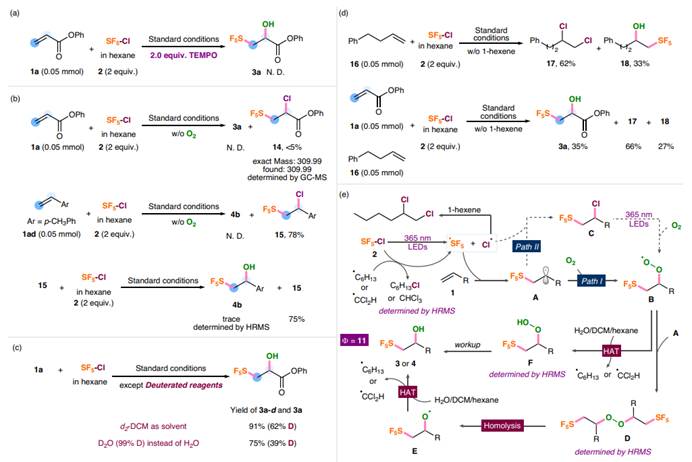 作者进行了相关的衍生化反应,合成获得了相关的α-SF5酮、SF5二醇、SF5环酯等,并且通过机理验证实验等探究了反应过程可能的机理。