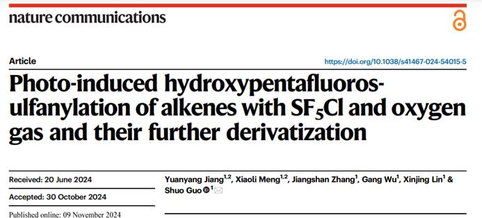 近日,db旗舰郭硕课题组基于前期研究基础,合成了一种新型的含氟醇——五氟硫基醇。相对于应用较为成熟的六氟异丙醇、三氟甲基醇等,作者通过光诱导完成了烯烃同时引入羟基以及五氟硫基两种官能团,得到相应的五氟硫基醇类化合物。该策略采用光诱导SF5Cl形成SF5自由基,使用氧气作为羟基源,绿色经济的条件下,克服了传统的自由基反应不可控的问题,同时抑制了氯自由基与烯烃的直接加成,一步法实现了烯烃的羟基五氟硫基化反应,获得一系列五氟硫基醇。这些五氟硫基醇还可以作为合成α-SF5酮、SF5二醇、SF5环酯的模块,为药物分子、新材料分子等的研发提供了新的策略。相关工作近期在国际著名化学期刊Nature Communications上发表。题目为“Photo-induced hydroxypentafluorosulfanylation of alkenes with SF5Cl and oxygen gas and their further derivatization”(论文链接:https://www.nature.com/articles/s41467-024-54015-5)。db真人博士生姜远洋和硕士生蒙笑莉为文章共同第一作者,db真人郭硕研究员为文章通讯作者。db真人为文章第一完成单位。