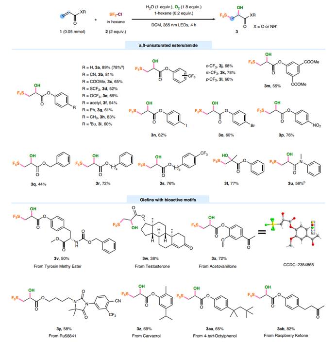 总之,作者发现了一种高效实用的烯烃羟基五氟硫基化方法,该方法适用于各种单取代和二取代烯烃(包括苯乙烯和吸电子烯烃),具有广泛的底物范围和官能团耐受性。此外,五氟硫基醇的相关衍生化反应可以为构建含有SF5基团的复杂分子提供新的途径。