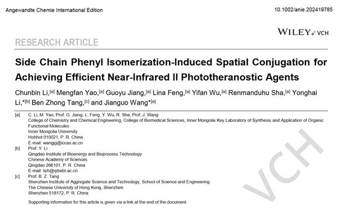 近日,db旗舰王建国教授团队联合中国科公司青岛生物能源与过程研究所李永海副研究员在国际顶级期刊Angewandte Chemie International Edition (Angew. Chem. Int. Ed. 2024. https://doi.org/10.1002/anie.202419785) 上发表题为“Side Chain Phenyl Isomerization-Induced Spatial Conjugation for Achieving Efficient Near-Infrared II Phototheranostic Agents”的重要研究成果。该团队首次提出了一种侧链苯基异构化诱导空间共轭策略,构建了兼具高荧光亮度和优异光热性能的近红外二区有机光诊疗聚集体并将其成功地应用于成像引导的肿瘤光热治疗。db旗舰博士研究生李纯斌(现为香港科技大学博士后)为论文的第一作者,王建国教授和中国科公司青岛生物能源与过程研究所李永海副研究员为通讯作者,db真人为本论文的第一完成单位。