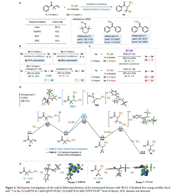 最后,作者进行了自由基捕获试验、量子产率测定、异构体转化等实验进一步对机理进行验证,并提出了反应过程可能存在的机理。该反应的整体过程可分为三个关键步骤:自由基加成 - 羰基迁移 - 链传播的串联过程。DFT计算为反应机理提供了证据,解释了反应的选择性、溶剂效应和温度影响:该反应中 SF5自由基先与 β,γ- 不饱和酮的碳碳双键加成形成中间体 Int1,随后通过能垒为 11.3 kcal・mol-1的过渡态 TS2 发生 1,2 - 羰基迁移,生成更稳定的叔碳自由基 Int2;Int2 因具有更高的单占分子轨道(SOMO)能量和全局亲核性,更易从 SF5Cl 中夺取氯原子,通过能垒 6.6 kcal・mol-1的过渡态 TS3 生成目标产物并再生 SF5自由基,此路径比 Int1 直接氯代(过渡态 TS2-1,能垒 15.0 kcal・mol-1)更有利;同时,卤代溶剂可稳定 TS2 促进目标产物生成,非极性溶剂中过渡态能垒差异缩小导致选择性反转,低温时两种反应路径能垒接近,高温更利于羰基迁移,而增加 SF5Cl 浓度会促进 Int1 直接氯代降低选择性。