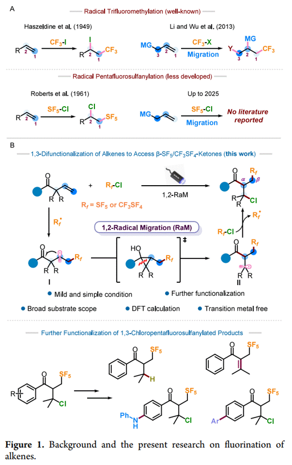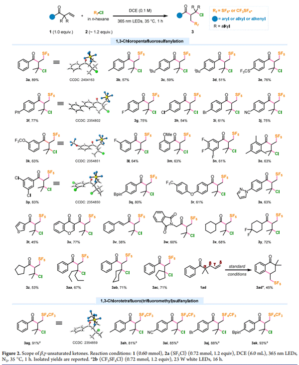 近日,公司郭硕课题组基于前期研究基础,与上海有机化学研究所薛小松研究员和四川大学章炜研究员等人在Journal of the American Chemical Society发表论文Radical 1,3-Difunctionalization of β,γ-Unsaturated Ketones via Concomitant 1,2-Carbonyl Migration: An Entrance toβ-SF5-/β-CF3SF4Ketones》,他们合作开发了一种无需金属参与的光诱导反应,通过β,γ-不饱和酮的1,2-羰基迁移实现自由基1,3-双官能化,高效构建了一系列β-SF5-和β-CF3SF4-酮类化合物,部分产物展现出优异的抗癌活性。该工作创新性地将自由基迁移(RaM)机制与五氟硫基(SF5)官能化结合,提出 “SF5自由基加成 - 1,2 - 羰基迁移 - 氯原子转移” 的串联路径,一步实现多重键的组合去构筑C-S\C-C\C-Cl键。首次实现自由基介导的 1,2 - 羰基迁移策略与五氟硫基化反应的交叉融合,成功实现 β,γ- 不饱和酮的 1,3 - 双官能化,这一突破填补了不饱和酮化学领域的研究空白,也为复杂含氟分子的模块化合成提供了全新方法论;此外,通过溶剂效应(如 DCE 中的溶剂笼效应)和温度调控(35℃利于目标产物,-20℃则生成异构体),实现产物的高选择性合成;最后,合成的含 SF5化合物 5 展现出优于临床药物的抗癌活性,同时通过 DFT 计算与控制实验揭示反应机理,为同类反应设计提供理论框架,实现从合成方法到应用价值的闭环。