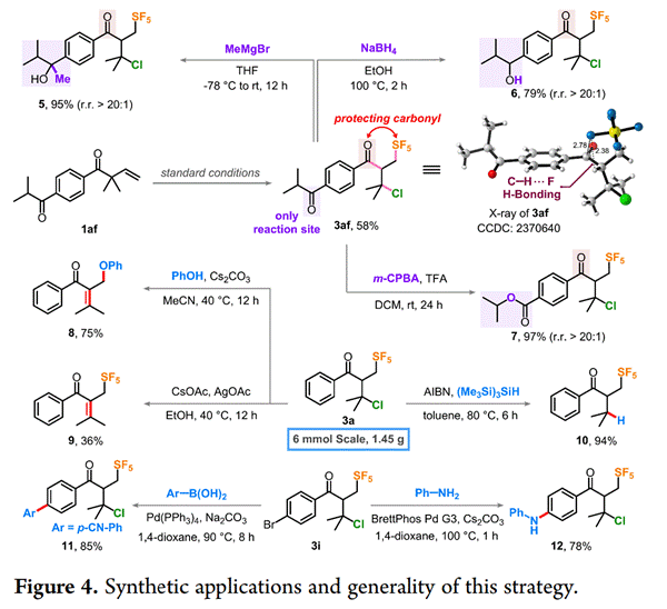 为了进一步验证该反应的潜在应用价值,作者进行了放大实验。反应成功放大至6 mmol,以克级产量高选择性得到相应的产物。此外,作者对其进行了一系列转化,合成了多种高附加值的复杂化合物。其中,二羰基底物 3af 的衍生化在格氏加成、还原和拜耳 - 维利格氧化反应中表现出高的区域选择性,反应更倾向于远离 SF5基团的羰基。通过单晶 X 射线衍射分析发现,化合物 3af 中 CH 基团与五氟硫基上的氟原子之间存在显著的分子内 C–H···F 氢键,这种相互作用使 SF5基团更靠近相邻的羰基,起到酮保护基的作用,防止亲核攻击。此外,β 位的偕二甲基可能进一步增加羰基周围的空间位阻。