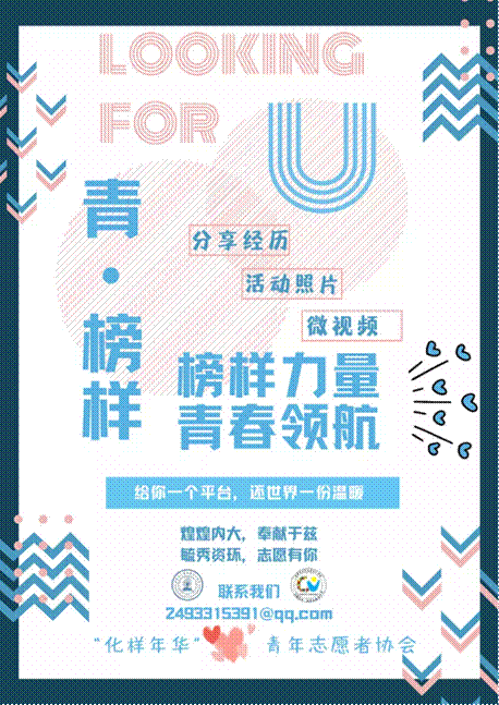 有人披荆斩棘、有人脚踏实地、有人创先争优、有人吃苦奉献、有人主动服务、有人任劳任怨、有人勇于担当……为挖掘向上的能量,汇聚前行的力量,“化样年华”青年志愿者协会特开设“青·榜样|榜样力量,青春领航”专栏(本栏目长期有效)征集身边的榜样,自身真实经历体会,身边志愿故事分享……都可以作为你的素材,还可配以照片或小视频发送至2493315391@qq.com,一经采用,还会有综测加分哦。