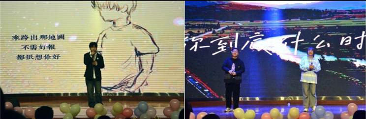 由吴晗、陈晨、温鑫同学带来歌曲串烧《南山南+贝加尔湖畔》,缓慢低沉的曲调向大家展现了关于友情、爱情的遗憾和期望。
