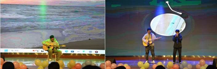 贾潇云、李子潮等同学的歌曲串烧《稻香+你曾是少年+带我去找夜生活》给人耳目一新的感觉,同学们听着熟悉的旋律,感受着演唱者赋予歌曲的情感,轻轻晃动手中的荧光棒。