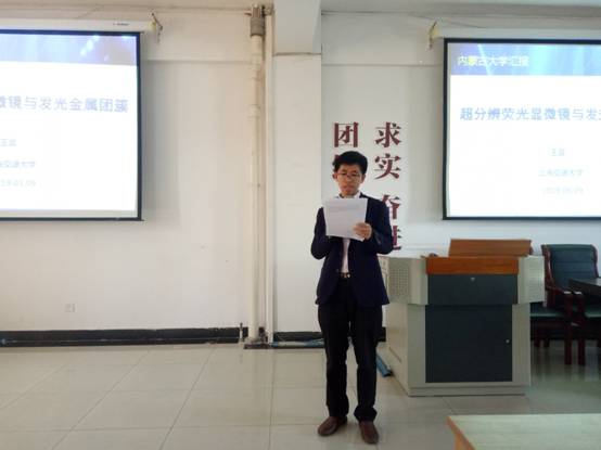 王富研究员作了题为“超分辨荧光显微镜与发光金属团簇”的报告。报告指出了传统光学显微镜的缺陷并提出了解决方法,介绍了一种多功能超分辨显微镜的实现方式和其所用荧光探针的合成。王富研究员介绍的仪器科学引起了同学和老师们的极大关注。在座师生与王富研究员积极探讨这类显微镜的实现方式,并期望能在公司引进。