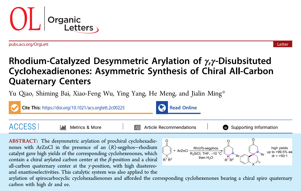 近日,db旗舰明佳林研究员课题组在国际知名学术期刊《Organic Letters》发表了学术论文“Rhodium-Catalyzed Desymmetric Arylation of γ,γ-Disubsituted Cyclohexadienones: Asymmetric Synthesis of Chiral All-Carbon Quaternary Centers” (https://pubs.acs.org/doi/10.1021/acs.orglett.2c00225),论文第一作者为本校博士研究生乔羽,第一单位为db真人,通讯作者为明佳林研究员。