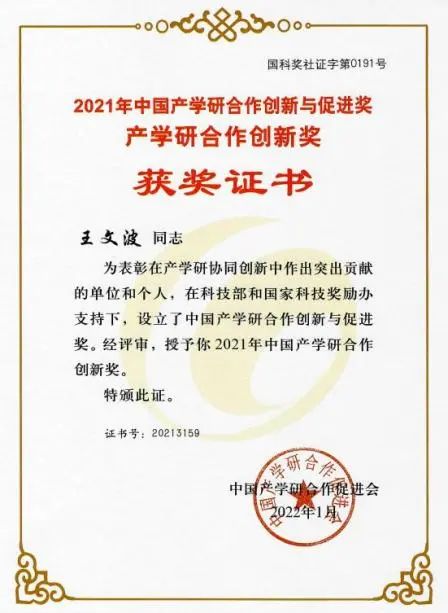 近日,中国产学研合作促进会公布了“2021年中国产学研合作创新与促进奖”评选结果,公司王文波教授荣获中国产学研合作创新奖(个人)。