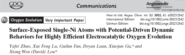 近日,db旗舰谷晓俊教授课题组取得重要研究进展,相关成果在化学领域的国际顶级学术期刊Angew. Chem. Int. Ed.上发表,题为“Surface-Exposed Single-Ni Atoms with Potential-Driven Dynamic Behaviors for Highly Efficient Electrocatalytic Oxygen Evolution”(论文连接:https://onlinelibrary.wiley.com/doi/10.1002/anie.202212542),并被选为VIP论文。