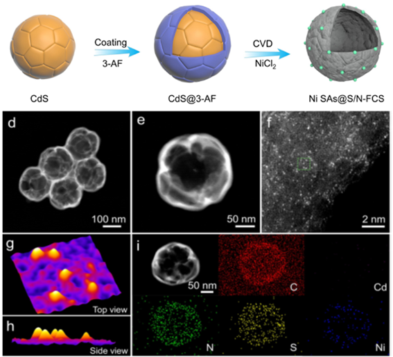 电解水析氧反应(OER)电催化剂的设计合成,对开发能量存储和转换的先进电化学装置具有重要意义,其中具有最大原子利用率的单原子催化剂研发是关键。目前,大多数单原子催化剂的催化活性中心暴露有限,导致与反应物分子接触不充分,造成催化反应效率与预期仍有很大差距。鉴于此,本研究首先利用3-氨基苯酚和甲醛之间的酚醛缩合反应在足球状CdS表面包覆一层树脂,并在高温下热解产生S/N共掺杂的中空碳球,然后采用化学气相沉积法在中空碳球外表面捕获Ni单原子,形成目标催化剂(简称Ni SAs@S/N-FCS),并系统研究了其微观结构和电催化OER性能。