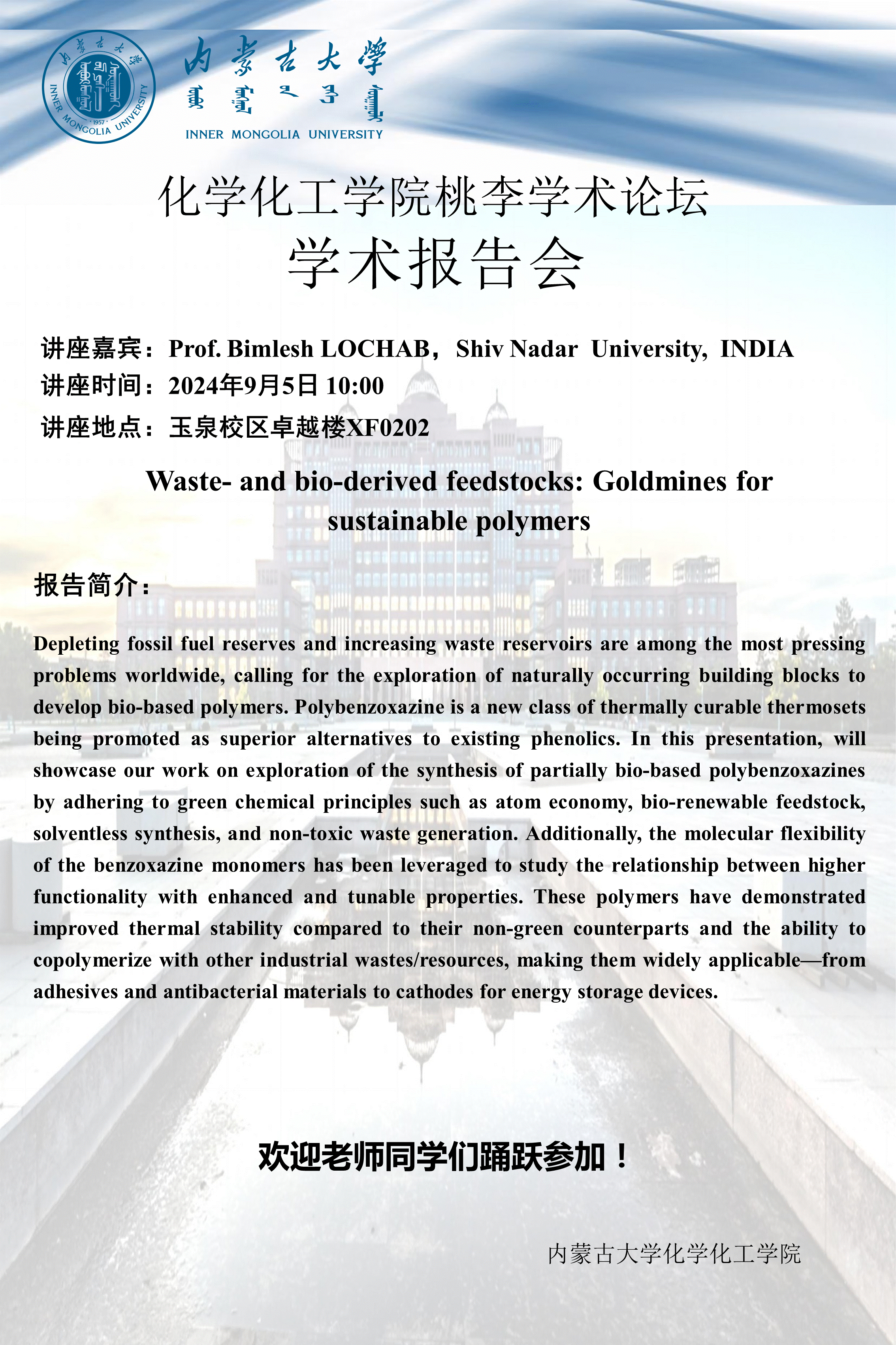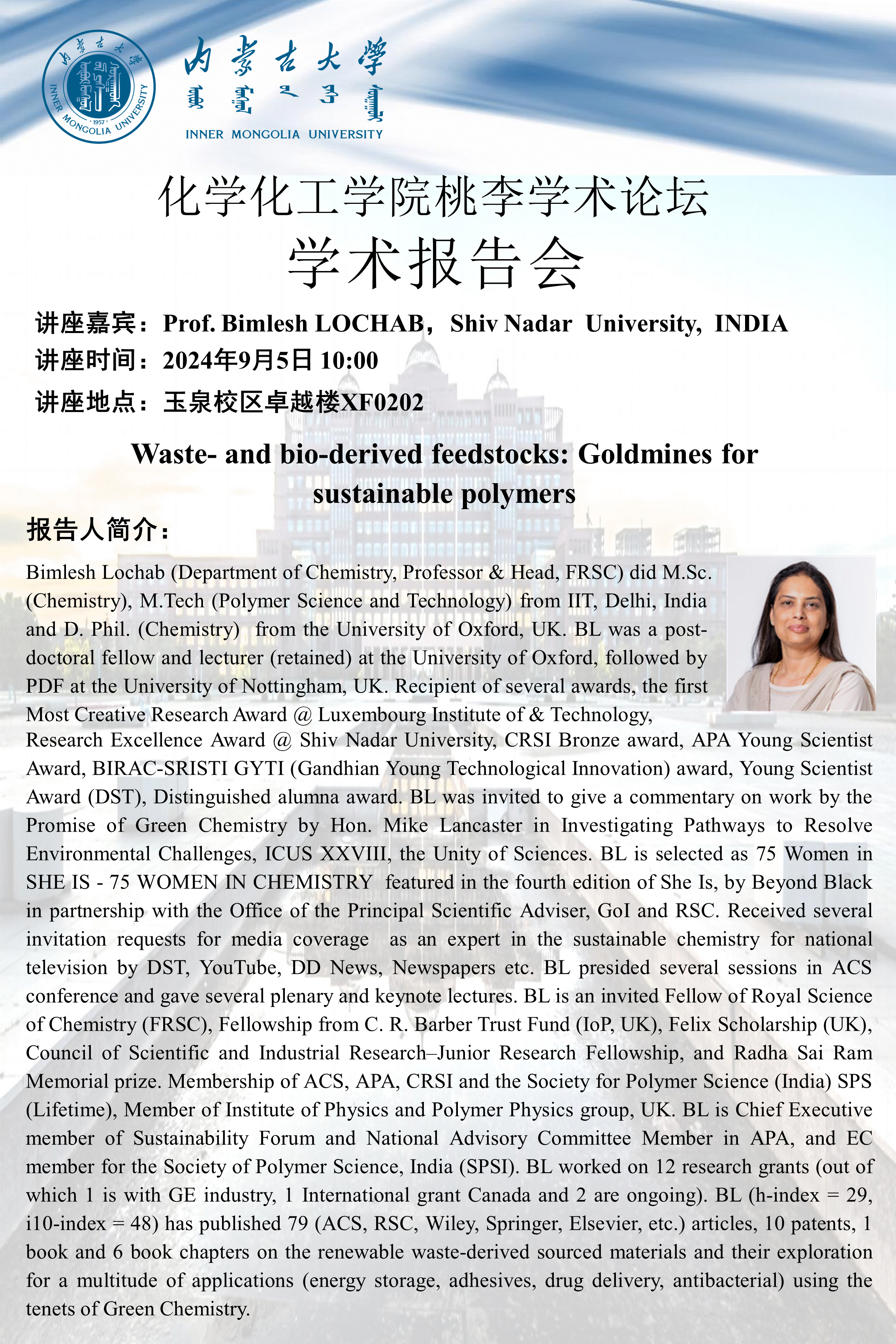 db旗舰桃李学术论坛——Waste- and bio-derived feedstocks: Goldmines for Prof. Bimlesh LOCHAB,Shiv Nadar University, INDIA