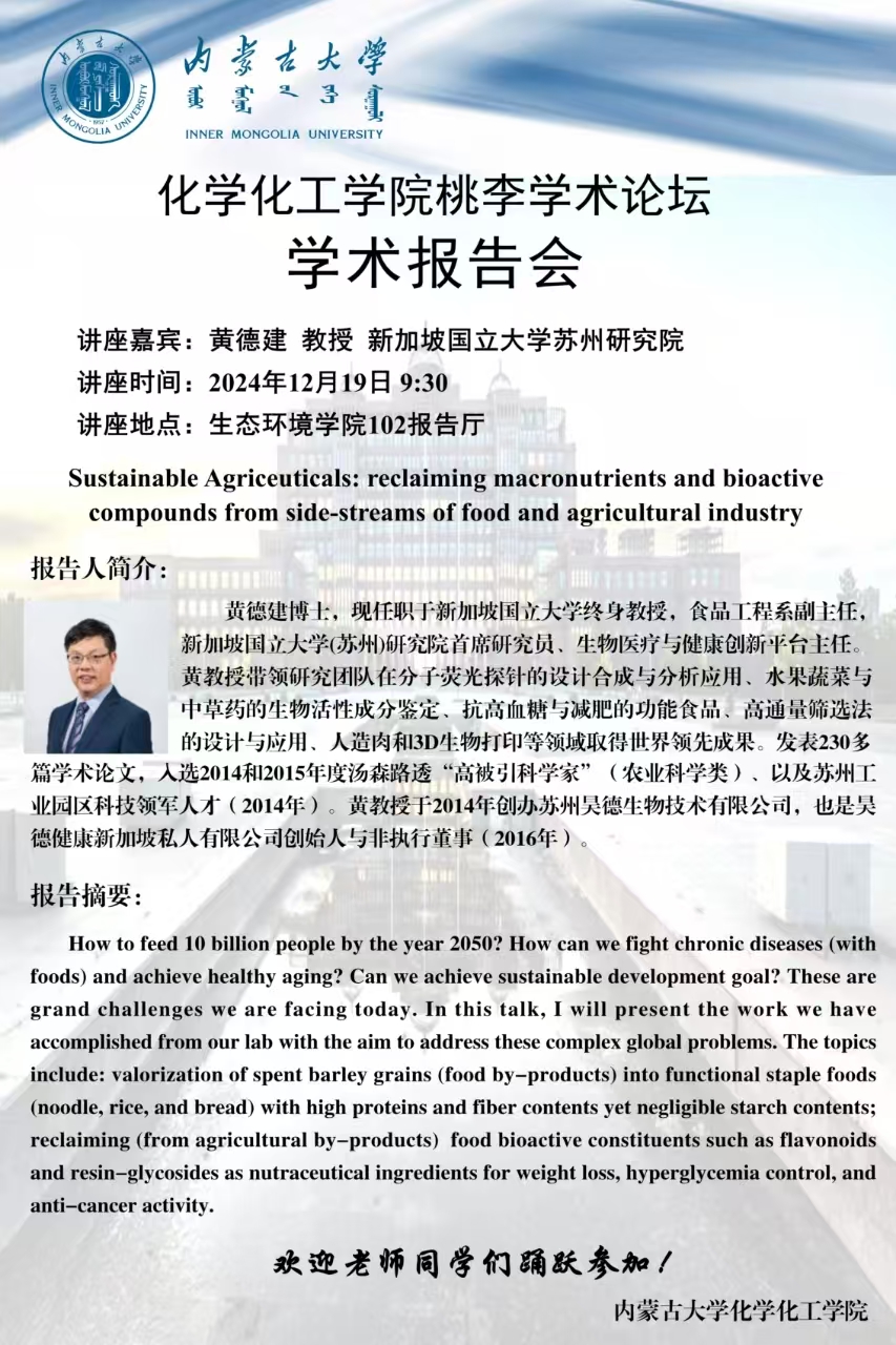 db旗舰桃李学术论坛——Sustainable Agriceuticals: reclaiming macronutrients and bioactive compounds from side-streams of food and agricultural industry 黄德建 教授 新加坡国立大学苏州研究院