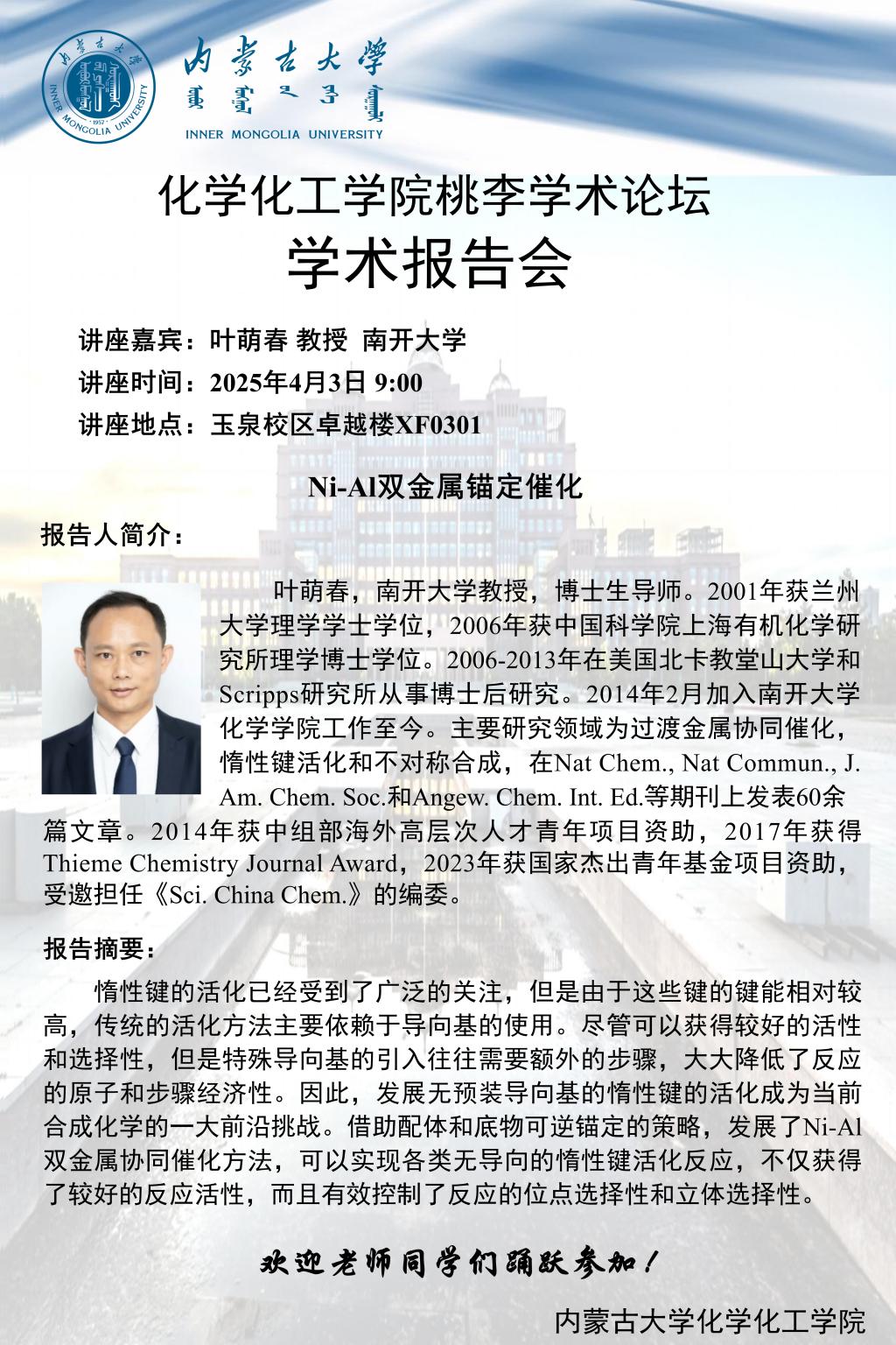 db旗舰桃李学术论坛——Ni-Al双金属锚定催化 叶萌春 教授 南开大学