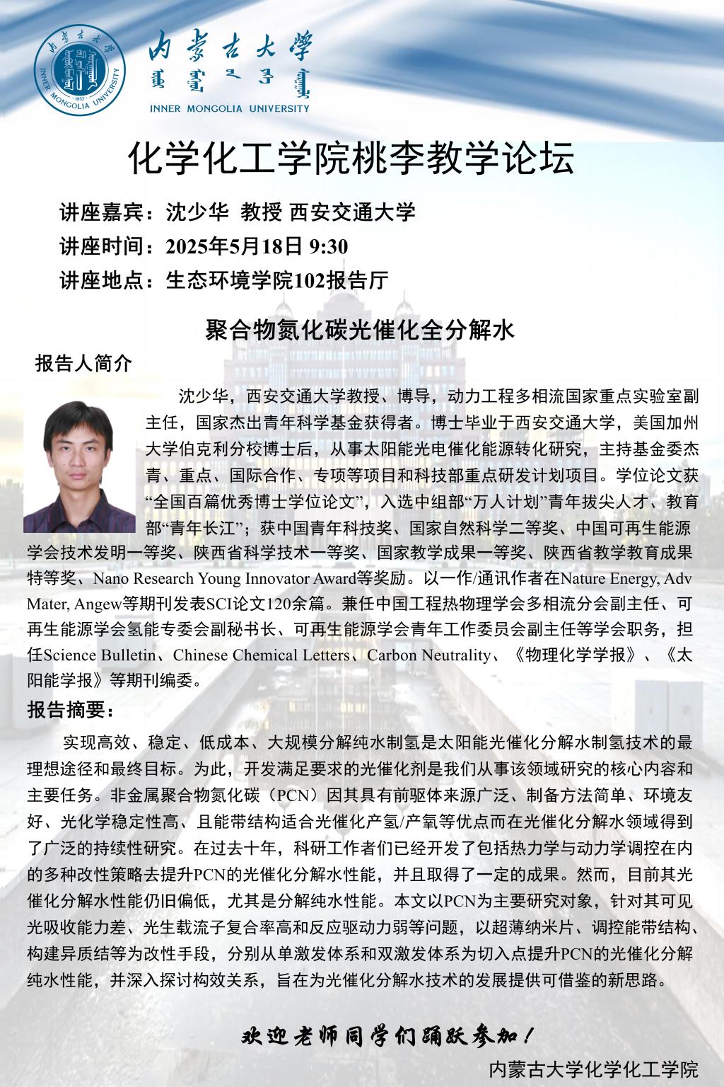 db旗舰桃李学术论坛——聚合物氮化碳光催化全分解水 沈少华 教授 西安交通大学
