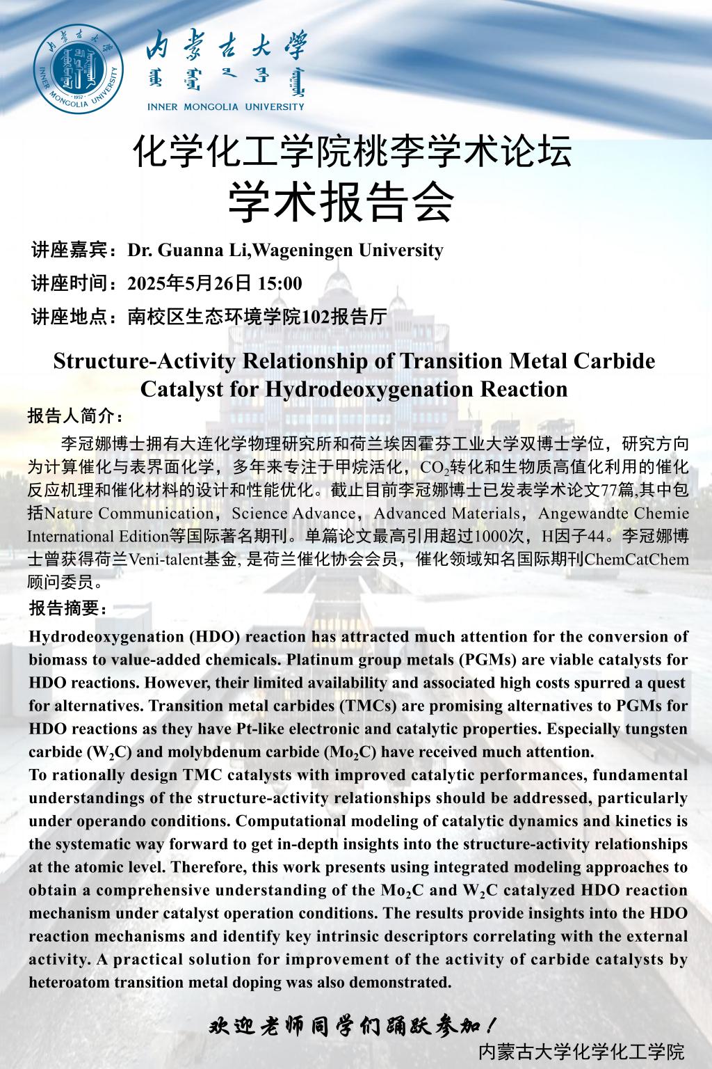 db旗舰桃李学术论坛——Structure-Activity Relationship of Transition Metal Carbide Catalyst for Hydrodeoxygenation Reaction